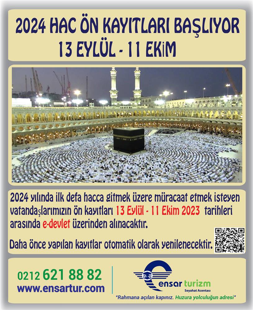 2024 yılında hacca gitmek üzere ilk defa müracaat etmek isteyen vatandaşlarımıza yönelik ön kayıtlar 13 Eylül'de başlayacak.