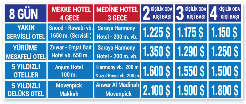 ACENTE kataloglarında belirtmiş olduğu Otel mesafeleri Mekke'de Harem-i Şerife, Medine'de ise Mescid-i Nebevi'nin avluları temel alınarak yazılmıştır.
