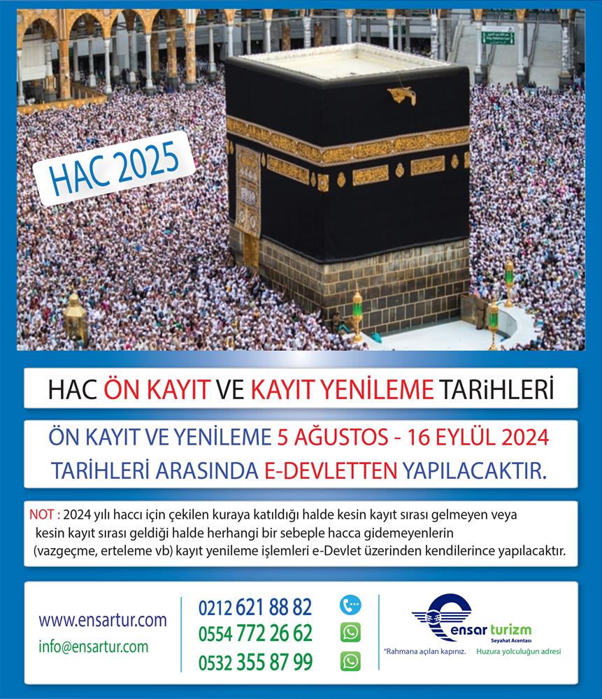Ayrıca Hac ve Umre Hizmetleri Genel Müdürlüğümüz çağrı merkezinden (0 850 260 13 13) hac ön kayıt süreci ile kayıt yenilemeye dair bilgi ve destek alınabilecek.