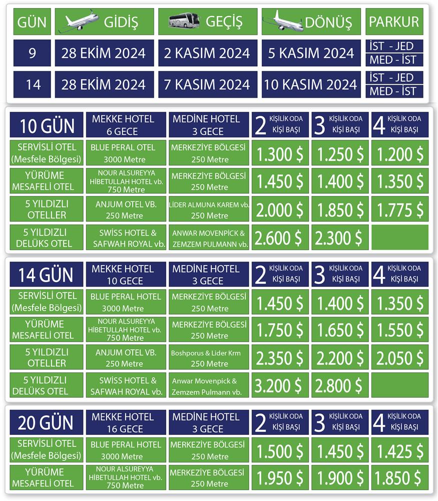 Programa dahil olan geziler harici ilave 2 Umreli turlarımız (15 gün ve üstü turlarımız için olup 15 günün altındaki turlarımızda en az bir imkanlar el verdiği takdirde 2 umre yaptırılacaktır.