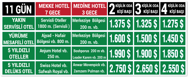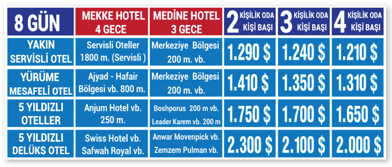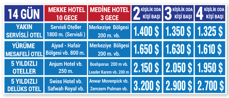 • Otel mesafeleri Mekke’de Harem-i Şerife, Medine’de ise Mescid-i Nebevi’nin avluları baz alınarak yazılmıştır.