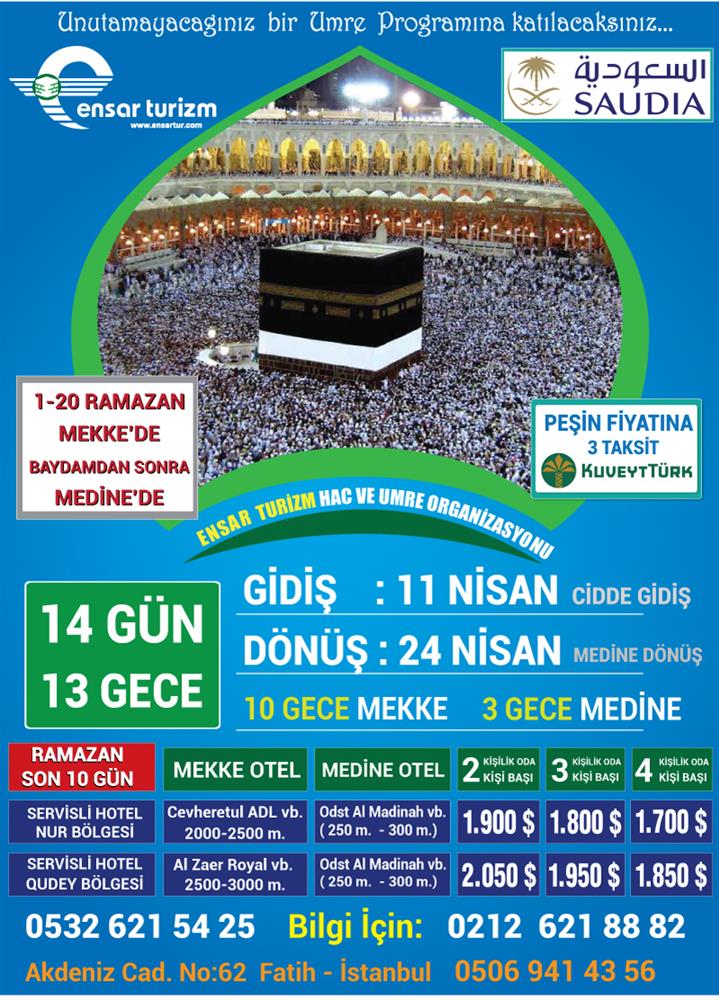 Programa dahil olan geziler harici ilave 2 Umreli turlarımız (15 gün ve üstü turlarımız için olup 15 günün altındaki turlarımızda en az bir imkanlar el verdiği takdirde 2 umre yaptırılacaktır.