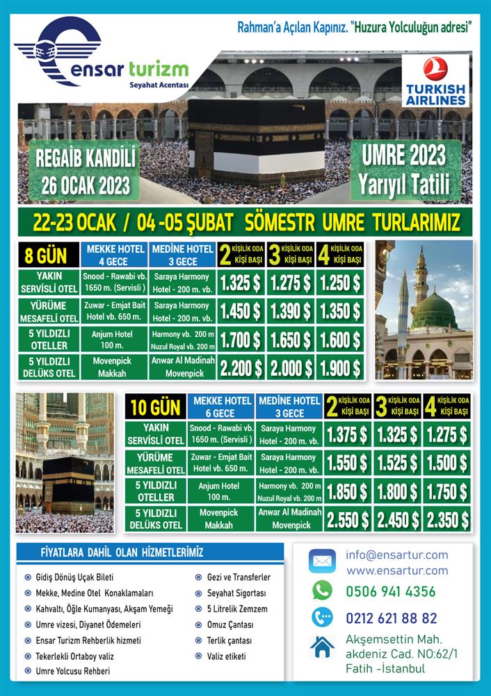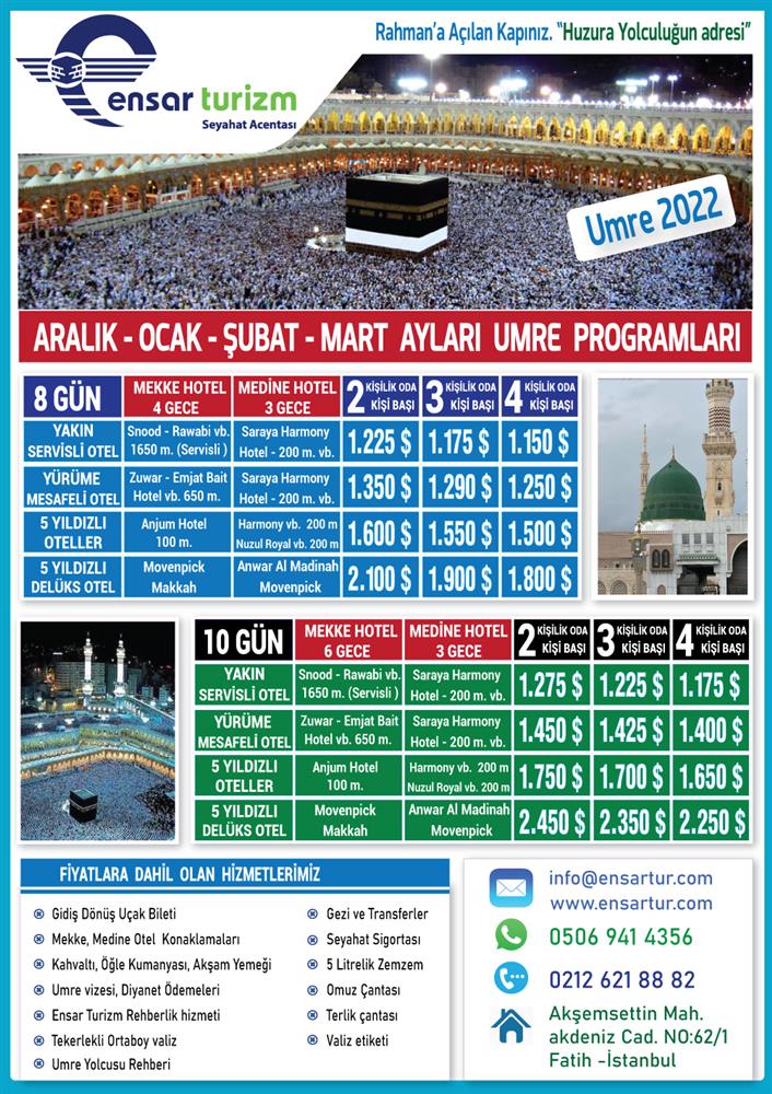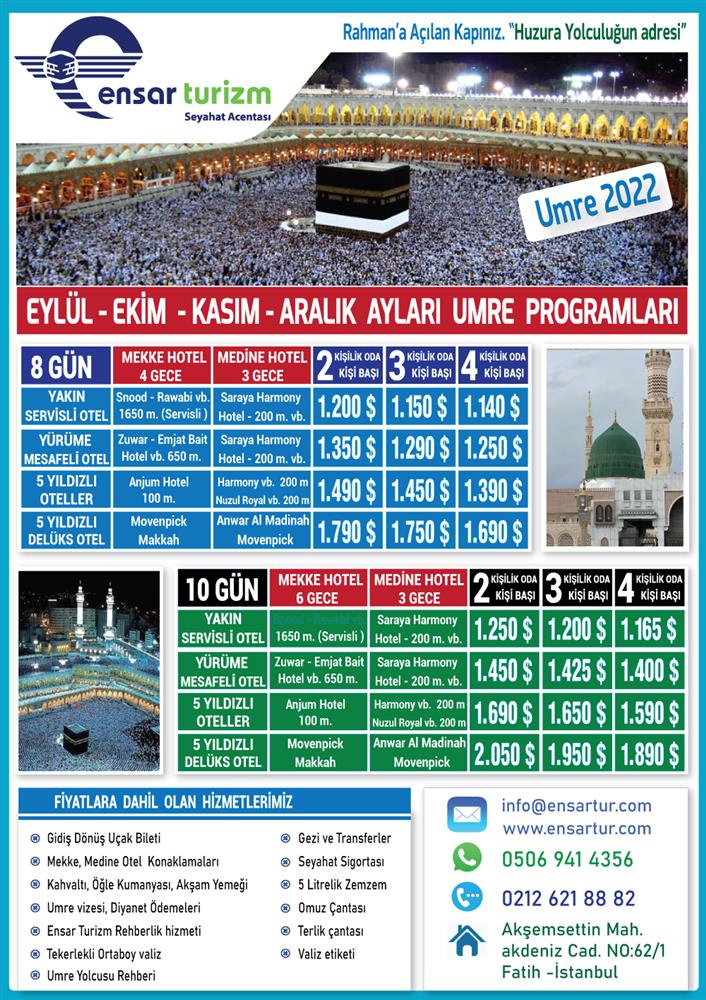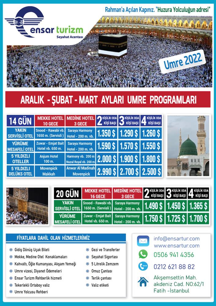 - Ensar Turizm ; Umre Programı kapsamında umre vizesi işlemleri sırasında, Ülkelerin Liman, Havaalanı, Havayolu veya benzer kurum ve kuruluşlarca tahsil edilen vergi, resim, harç ve benzeri yasal yükümlülüklerden meydana gelen değişikliklerden kaynaklanan ilave ek ücretleri Tur fiyatına yansıtma hakkını kendinde saklı tutar.